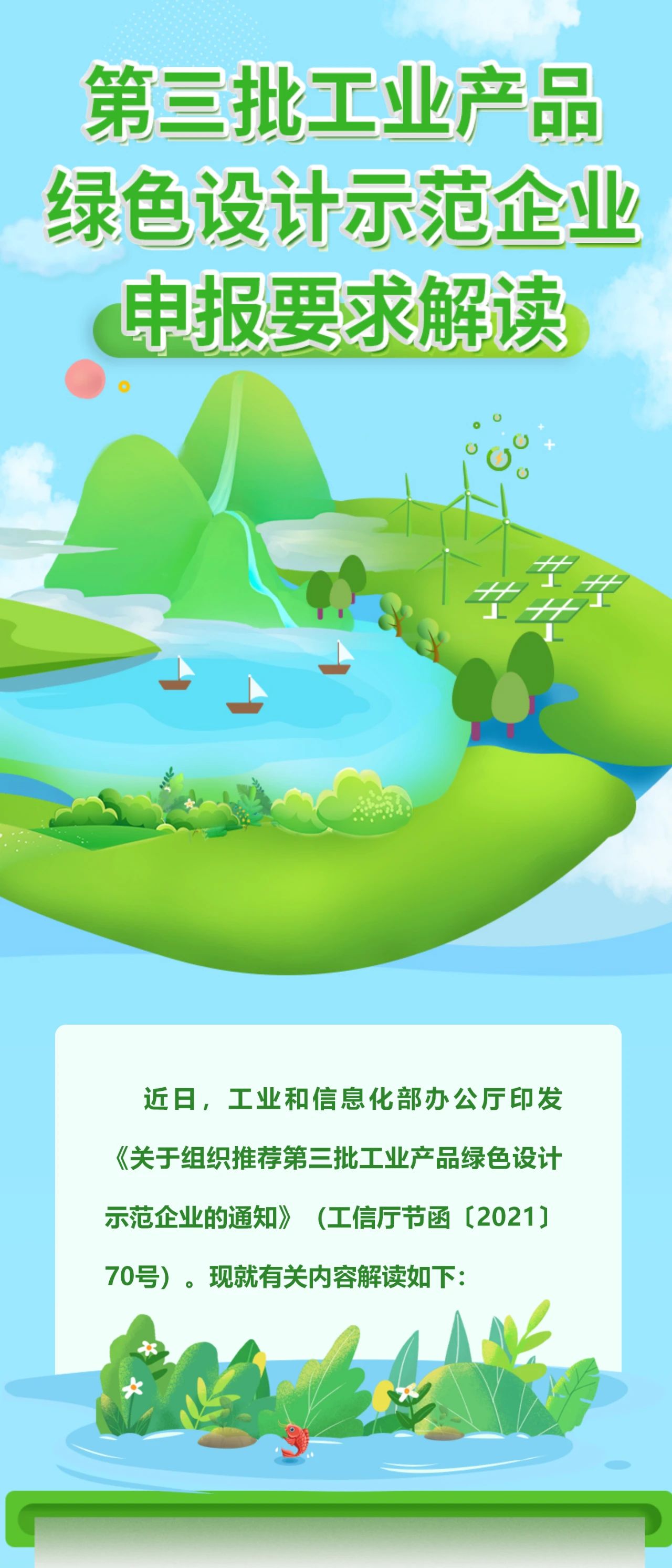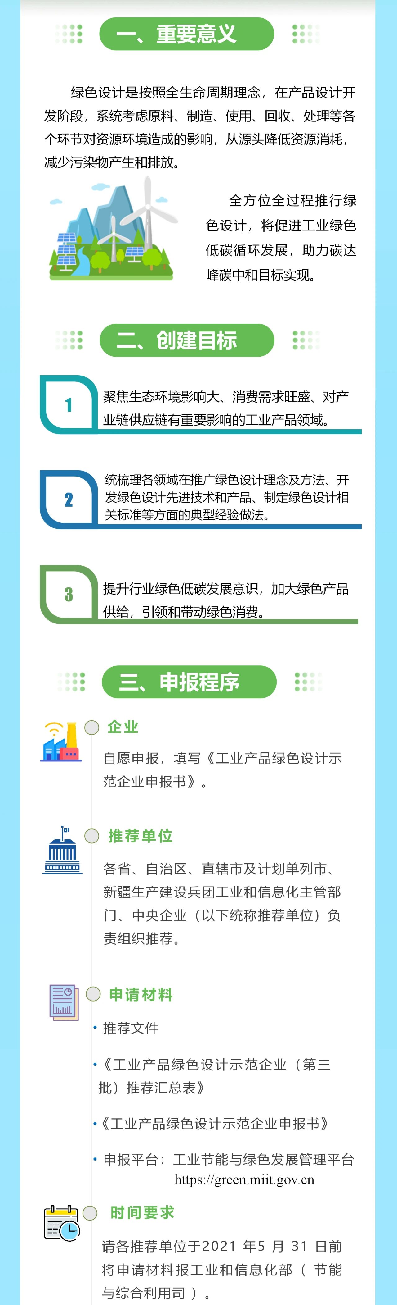为贯彻落实《国务院关于加快建立健全绿色低碳循环发展经济体系的指导意见》(国发〔2021〕4号),全方位全过程推行绿色设计,促进工业绿色低碳循环发展,助力碳达峰碳中和目标实现,现组织开展第三批工业产品绿色设计示范企业推荐工作。有关事项通知如下: