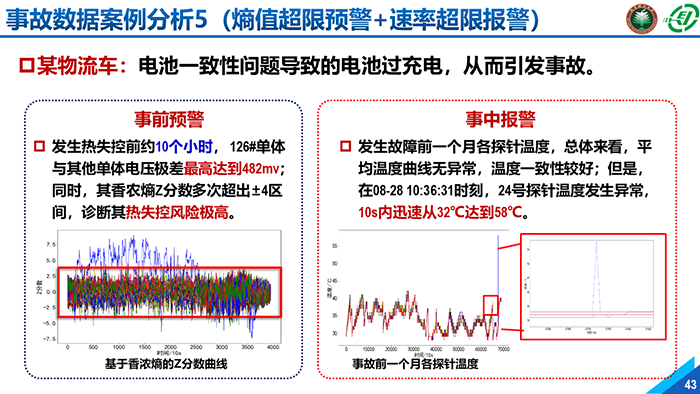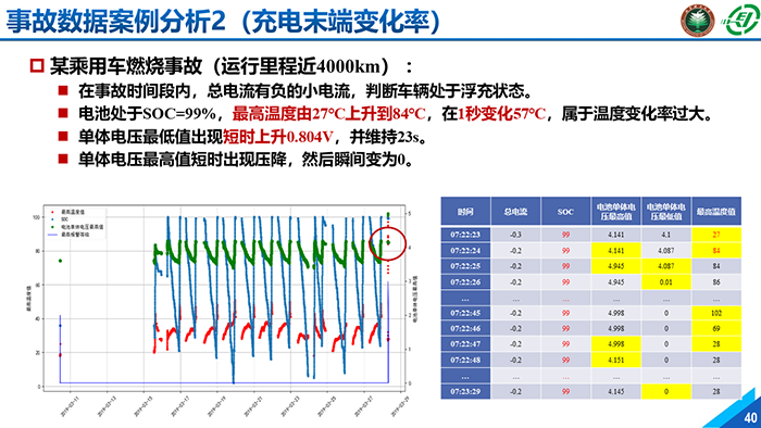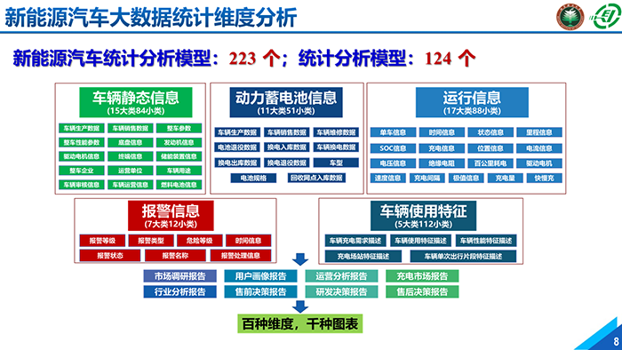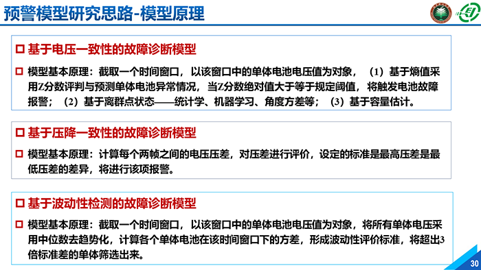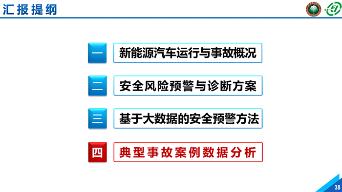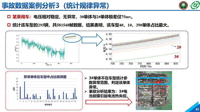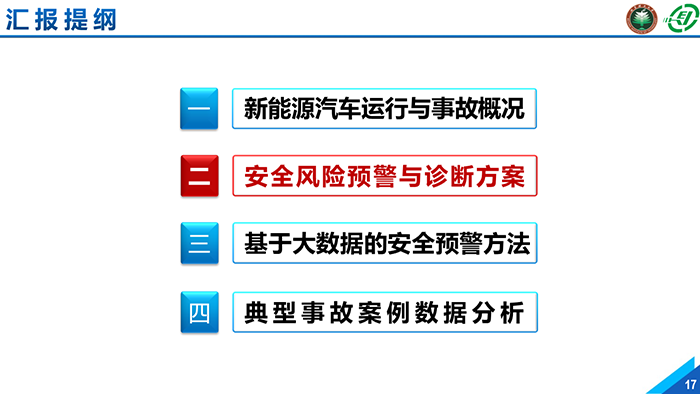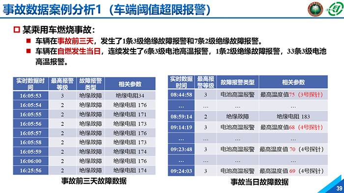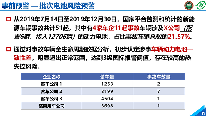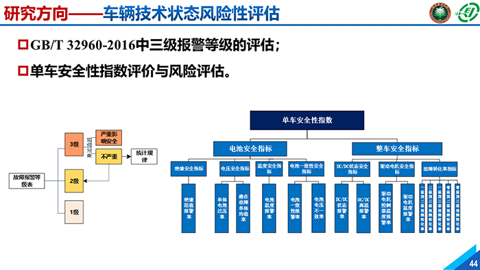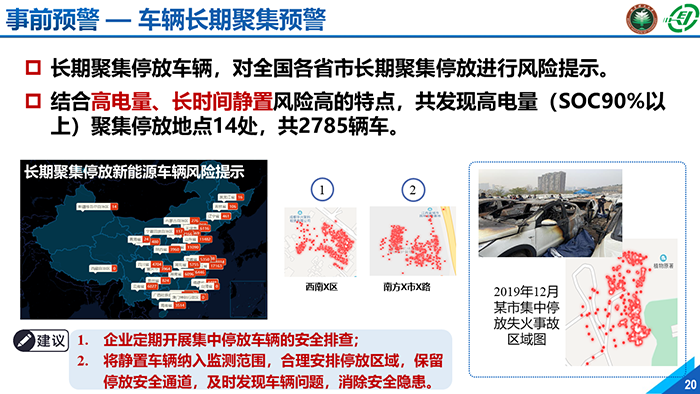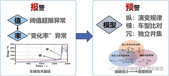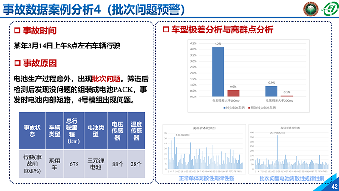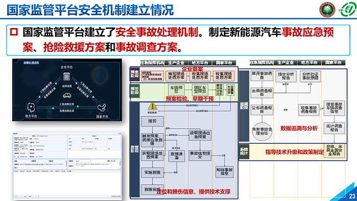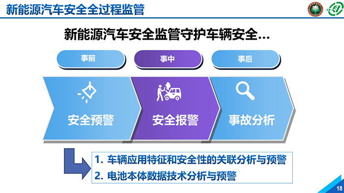新能源汽车安全监管是国家平台的一项重要工作。国家平台充分发挥技术优势,建立了事故预警、报警、分析全链条模型,包括事前安全预警、事中安全报警、事后事故分析。其中,事前安全预警包括车辆应用特征和安全性的关联分析与预警以及电池本体数据技术分析与预警。一个偏向于车的使用,而另一个则偏向于电池本体的技术。它们更多是用来做一个风险的评估。