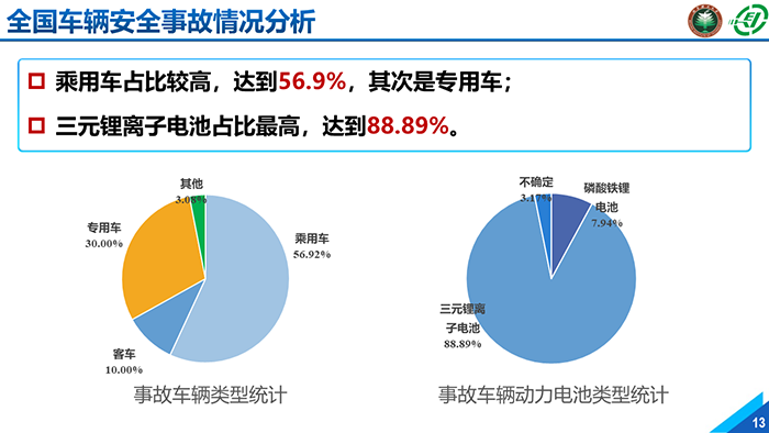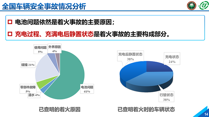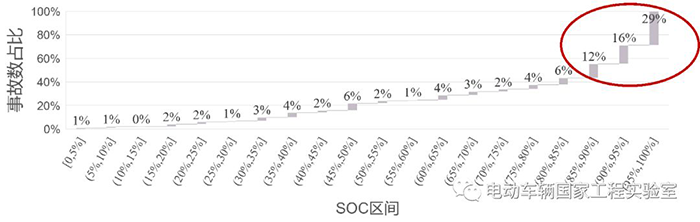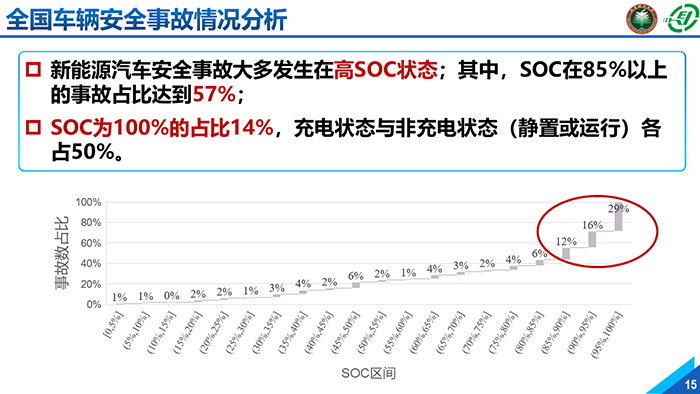 车辆应用特征与安全性方面,统计发现,电池问题依然是着火事故的主要原因。已查明着火时的车辆状态,充电过程、充满电后静置状态是着火事故的主要构成部分。新能源汽车安全事故大多发生在高SOC状态,其中SOC在85%以上的事故占比达到57%,SOC为100%的占比为14%。充电状态与非充电状态(静置或运行)各占50%。电池随着长时间以及高里程的使用有一个退化的过程,退化的过程中是否适合把电池充满都是值得关注的。