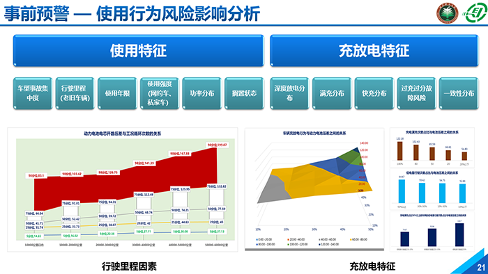 另外,车辆行驶里程、使用年限、使用强度等使用特征,以及满充分布、快充分布、一致性分布等充放电特征等使用行为都成为事前安全风险评估的重要方面。