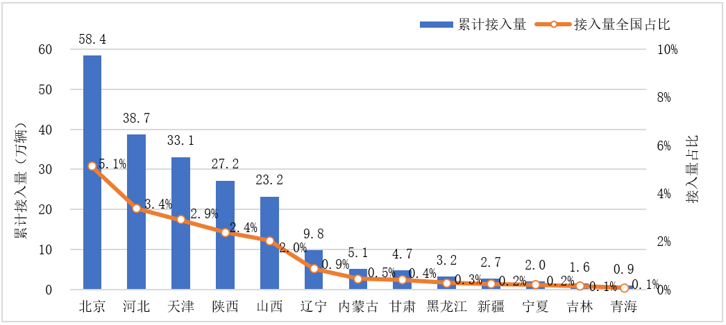 京津冀表现突出。从冬季低温地区各省份新能源汽车累计接入量来看,华北地区北京市、河北省、天津市累计接入量排在前三位,均在30万辆以上。其次是陕西省和山西省,分别累计接入27.2万辆和23.2万辆;辽宁省累计接入9.8万辆,排在东北地区首位。