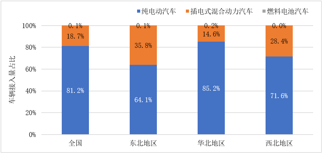东北、西北地区插电混动汽车市场占比较高。纯电动汽车为各地区主流推广车辆类型,华北地区纯电动汽车累计接入量占比为85.2%,明显高于全国整体水平;东北地区和西北地区插电式混合动力汽车占比较高,分别为35.8%和28.4%,明显高于全国水平。