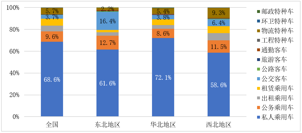 私家车为各地区主要应用场景。华北地区新能源私家车累计接入量占比72.1%,高于全国整体水平;东北地区公交客车推广占比较高,达到16.4%;西北地区物流特种车推广是一大特色,占比为9.3%。