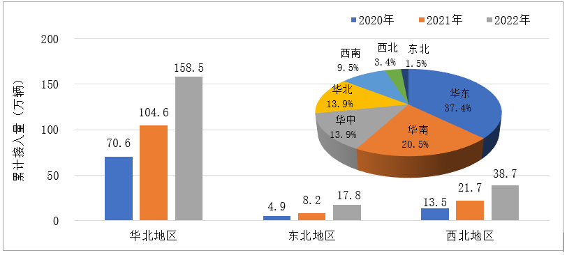 1.低温地区消费者对新能源汽车的认可度逐渐提高。近年来,低温地区新能源汽车历年接入量保持快速增长趋势。截止2022年11月底,低温地区新能源汽车累计接入规模超过215万辆,全国占比近1/5。新能源汽车产品多样化及耐低温技术不断进步,带动消费者对新能源汽车的认可程度不断提高。