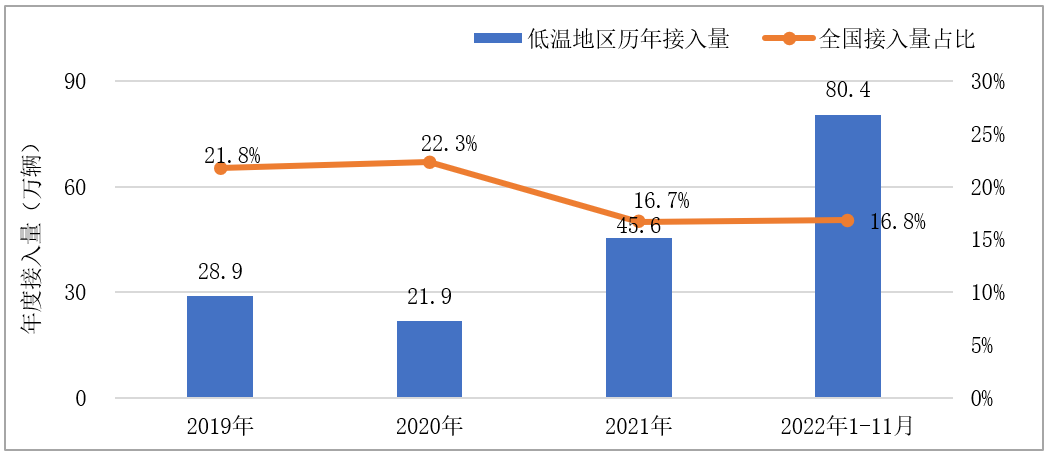 年度接入量快速增长。自2019年以来,除2020年接入量占比较上年有小幅下降以外,低温地区新能源汽车历年接入量均保持较快增长速度,2022年1-11月接入量80.4万辆,同比增长76.5%。