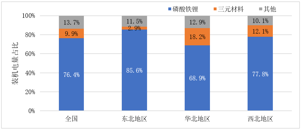 东北地区磷酸铁锂装机电量占比更高,占比为85.6%;华北地区新能源乘用车推广占比较大,三元电池装机电量占比相对更高,占比为18.2%。