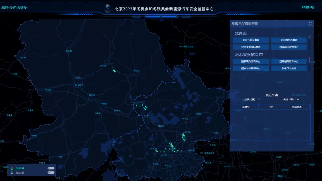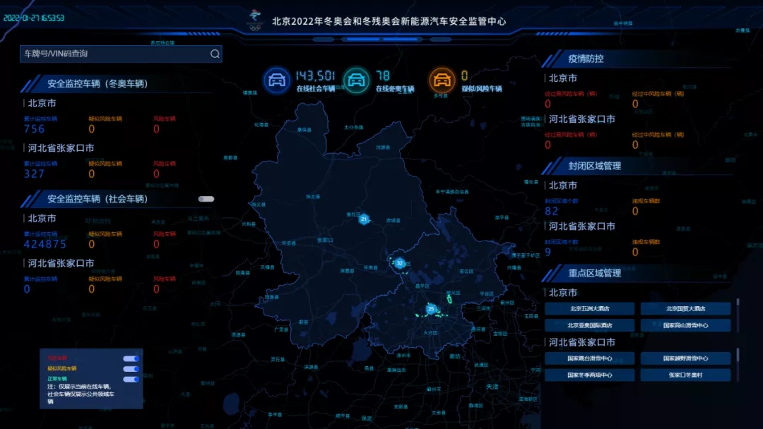 冬奥会期间,冬奥防控平台对冬奥会运输服务车辆和社会车辆实施分类分级管理,重点关注运动员通勤车辆、媒体记者、奥运服务人员乘坐车辆,并建立电子档案;其次关注冬奥会办公场地、比赛场地及通勤路线周边的社会车辆。对安全监管区域内车辆开展全天候立体化监测,包括运行监测、充电监测、停车监测、行车环境监测等。对重点关注车辆,实时轮询车辆安全风险,对其他分级管控车辆,分级别定时轮询车辆安全风险状态。监测车辆发生故障报警、热失控征兆等情况及时报送相关部门。冬奥组委相关人员可以通过大屏关注车辆实时位置和运行状态。