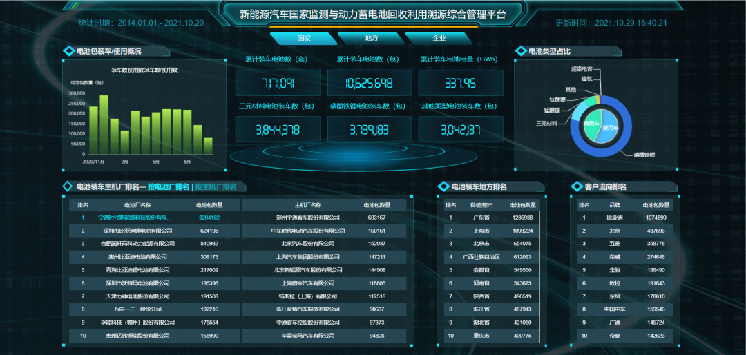 新能源汽车国家监测与动力蓄电池回收利用溯源综合管理平台(简称“国家溯源平台”)自2018年8月全面上线以来,国家溯源平台平稳运行,短短三年多的时间,电池包接入量已经突破一千万,截止目前接入数据的企业达到313家,平台车辆数据超710万辆。