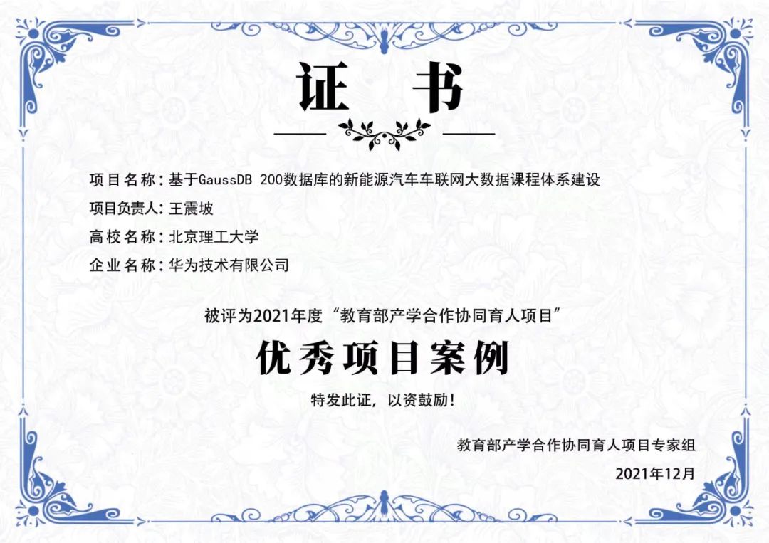 基于GaussDB 200数据库的新能源汽车车联网大数据课程体系建设项目入选2021年度教育部产学合作协同育人项目优秀项目案例