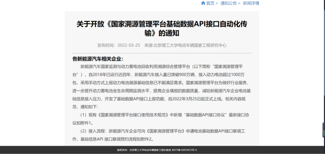 为做好行业服务,进一步提升动力蓄电池全生命周期监测水平,提高企业填报的数据质量,减轻新能源汽车企业电池基础信息接入压力,新能源汽车国家监测与动力蓄电池回收利用溯源综合管理平台(以下简称“国家溯源管理平台”)开发了基础数据API接口上报功能,自2022年3月25日起正式上线。国家溯源管理平台官网当天发布了《国家溯源管理平台接口使用技术规范》与申请电池基础数据API接口联调工作流程。