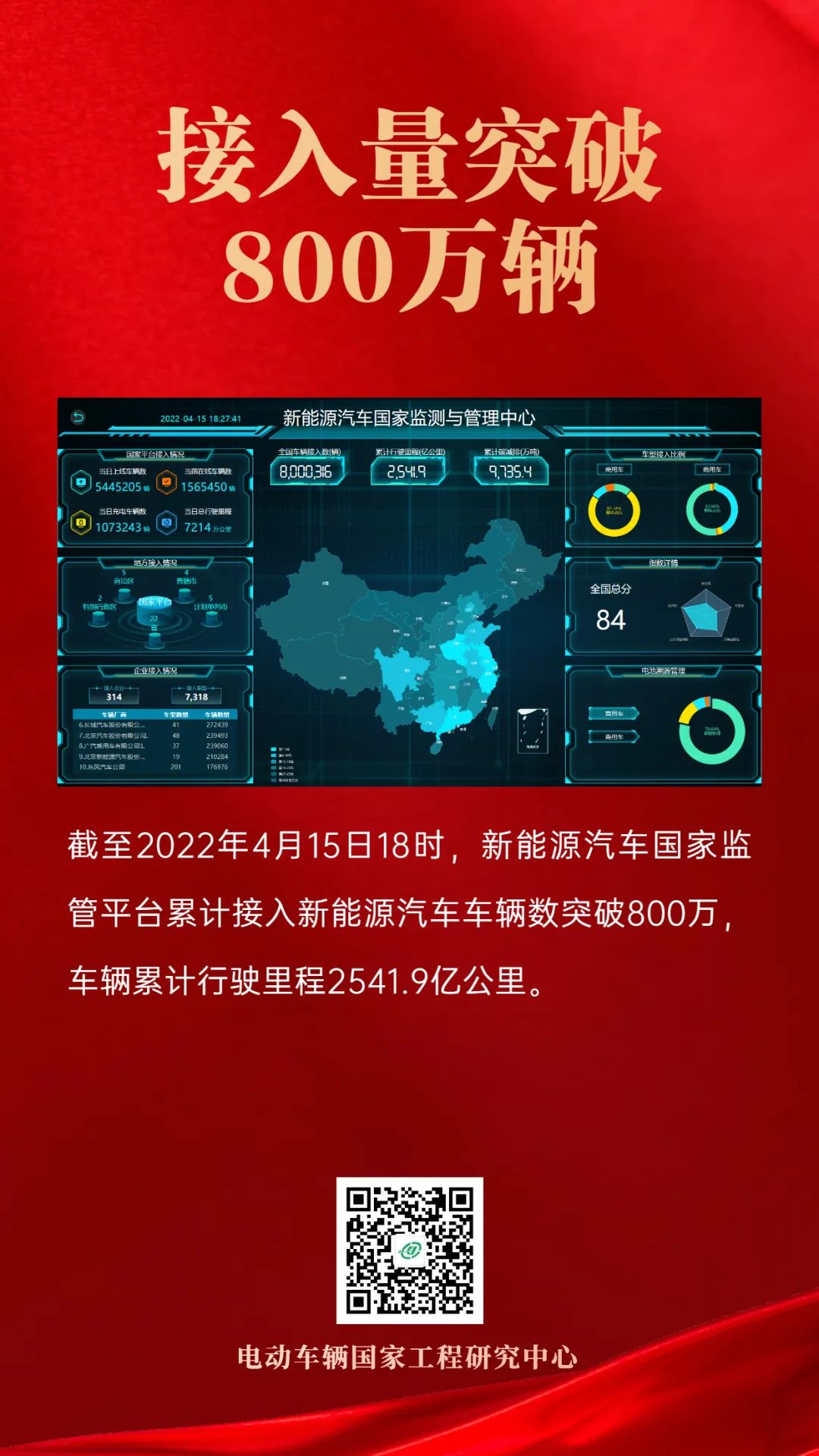 最新 | 截至2022年4月15日18时,新能源汽车国家监管平台累计接入新能源汽车车辆数突破800万!