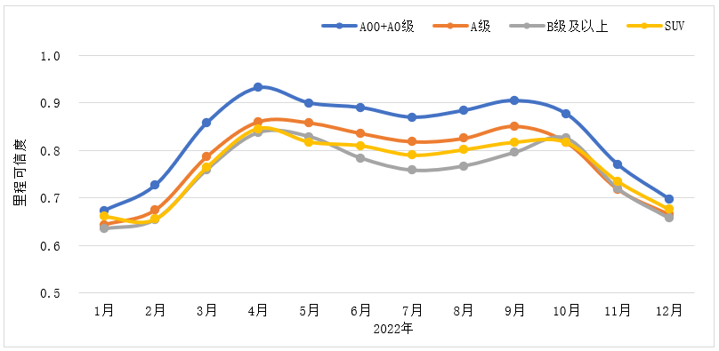 不同级别车型的月度里程可信度呈现“M”型分布。冬季气温较低,低温地区各级别车型里程可信度均处于较低水平,里程可信度整体在0.7以下;分级别车型来看,A00+A0级车型各月度里程可信度明显高于其他级别车型,其中,4月、5月、9月里程可信度在0.9以上。