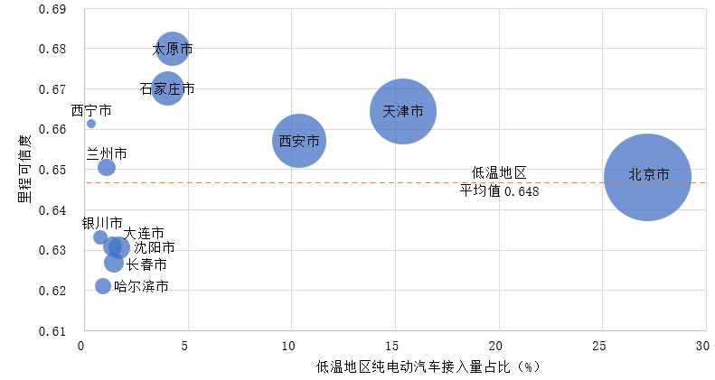 冬季低温地区城市里程可信度与纬度分布强相关,纬度越高,里程可信度越低。低温地区冬季受气温影响,纯电动汽车里程可信度整体受到一定影响,典型城市里程可信度介于0.6-0.7之间。北京、天津、西安、太原、石家庄等城市冬季严寒天气较少,车辆里程可信度高于低温地区里程可信度平均值(0.648),哈尔滨、长春等城市受高纬度影响,冬季气温较低,车辆里程可信度低于平均值。