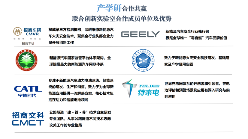 联合创新实验室将着眼下一代电动汽车技术,以电动汽车火灾安全为焦点,联合开展技术攻关、标准制修订、人才培养、成果转化,搭建电动汽车产品开发、测试评价、运行监管、消防救援、事故调查的全产业链火灾安全体系,为行业和国家提供技术支撑。