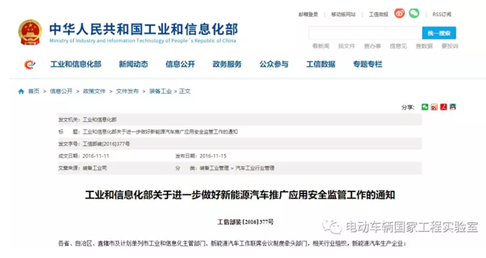 2016年11月,《工业和信息化部关于进一步做好新能源汽车推广应用安全监管工作的通知》(工信部装[2016]377号)文件发布,提出生产企业要建设和完善新能源汽车企业监测平台,与用户充分沟通并签订保密协议,自2017年1月1日起对新生产的全部新能源汽车安装车载终端,通过企业监测平台对整车及动力电池等关键系统运行安全状态进行监测和管理,按照《电动汽车远程服务与管理系统技术规范》(GB/T 32960)国家标准要求,将公共服务领域车辆相关安全状态信息上传至地方监管平台。企业监测平台应设置国家监管平台接口,接受国家监管平台的监督抽查,在接到国家监管平台实时数据调用指令时,应当按指令要求将对应车辆的相关安全状态信息上传至国家监管平台。生产企业要合理设置整车及电池安全阈值,通过企业监测平台实时监测关键系统运行参数,对发现存在安全隐患的车辆,要及时预警并采取有效措施消除隐患。已销售的新能源汽车产品,整车企业要按照国家标准要求免费提供车载终端、通讯协议等相关监测系统的升级改造服务,及时通知用户说明远程安全监测的必要性,争取逐步纳入国家监管平台。