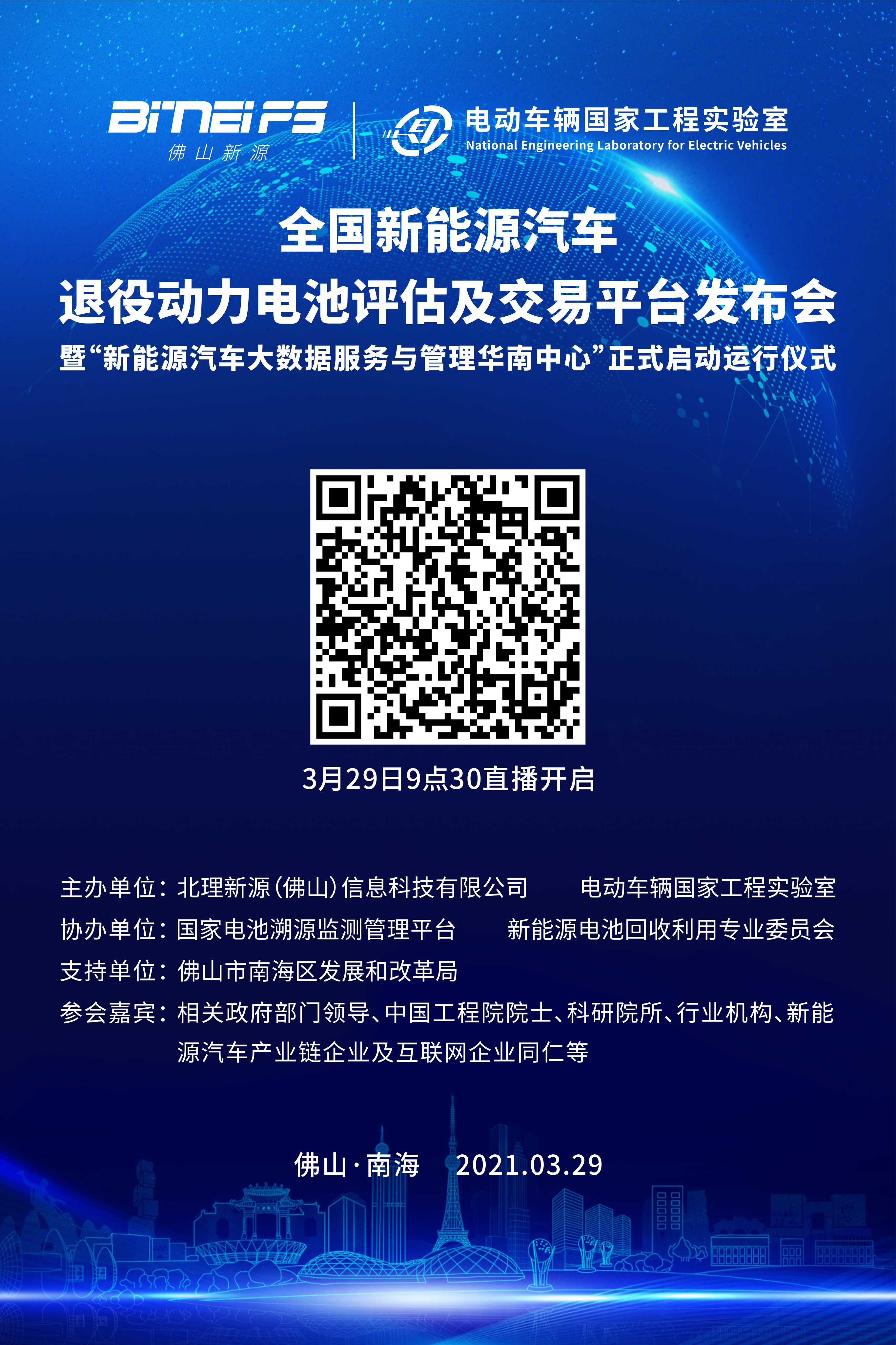 以全国新能源汽车退役动力电池评估及交易平台发布会暨“新能源汽车大数据服务与管理华南中心”正式启动运行仪式为主题,由北理新源(佛山)信息科技有限公司联合电动车辆国家工程实验室举办的发布会即将于2021年3月28-29日在广东省佛山市金融城岭南东方酒店盛大启幕。